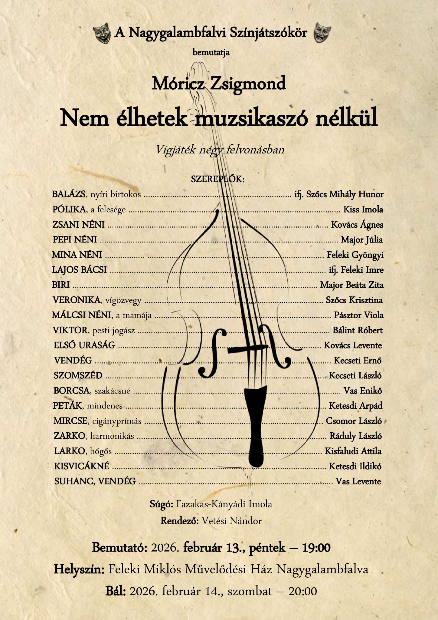 A Nagygalambfalvi Színjátszókör legújabb bemutatójára készül: Móricz Zsigmond közkedvelt vígjátékát, a Nem élhetek muzsikaszó nélkül című darabot viszik színpadra négy felvonásban. Az előadás a hagyományos falusi világ hangulatát, a zene, a szerelem és az emberi gyarlóságok humorral átszőtt történetét idézi meg.