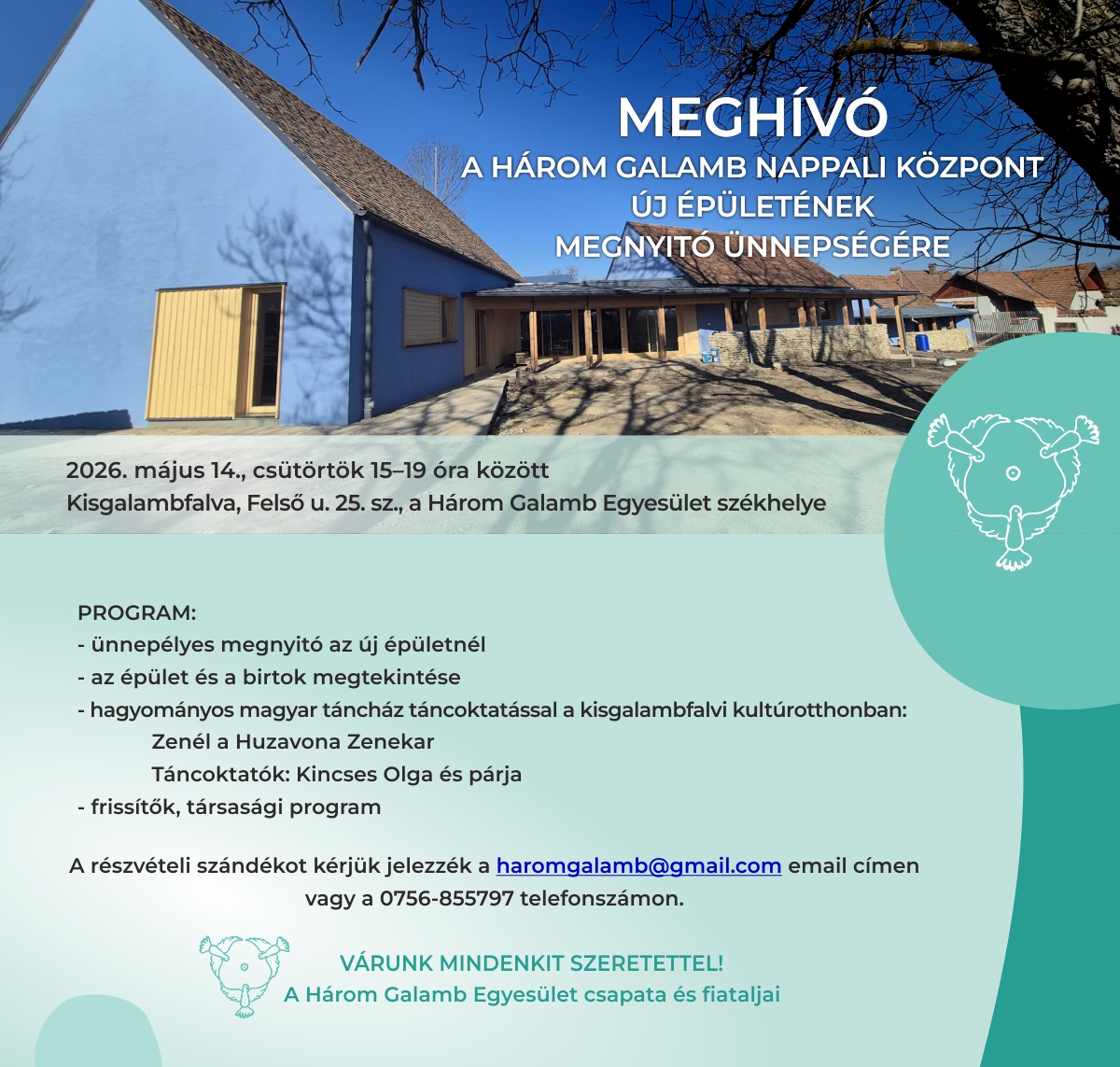 A romániai Erdélyben található új Camphill közösség, a Három Galamb Egyesület meghívja Önt a nappali központunk új épületének megnyitójára. Az ünnepélyes megnyitó egy kétnapos INKLÚZÍV konferencia része lesz.